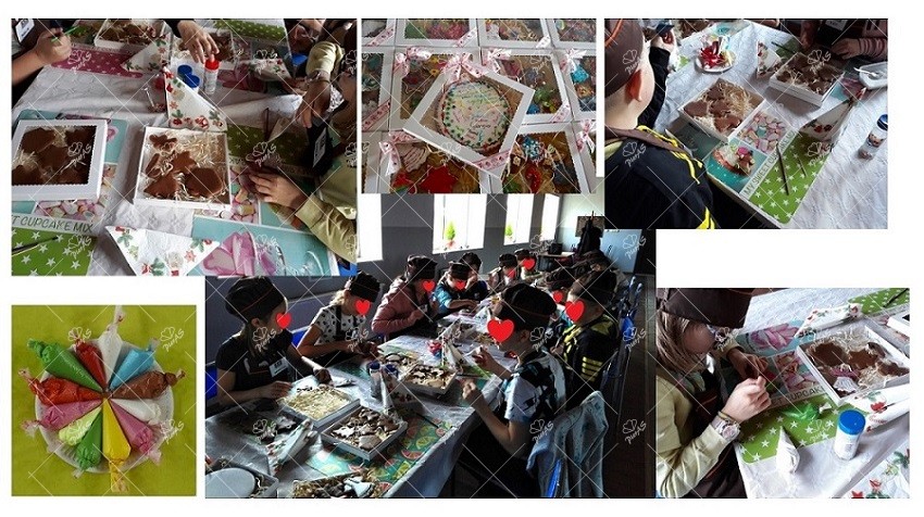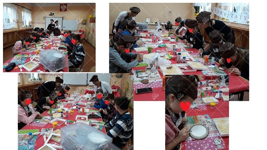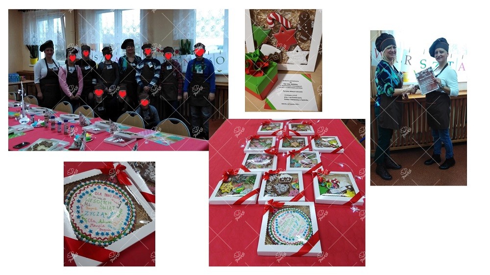 Każdy uczestnik otrzymuje fartuch i czapkę na czas trwania spotkania, co buduje atmosferę piernikowej pracowni i daje poczucie wspólnego tworzenia w jednym zespole.