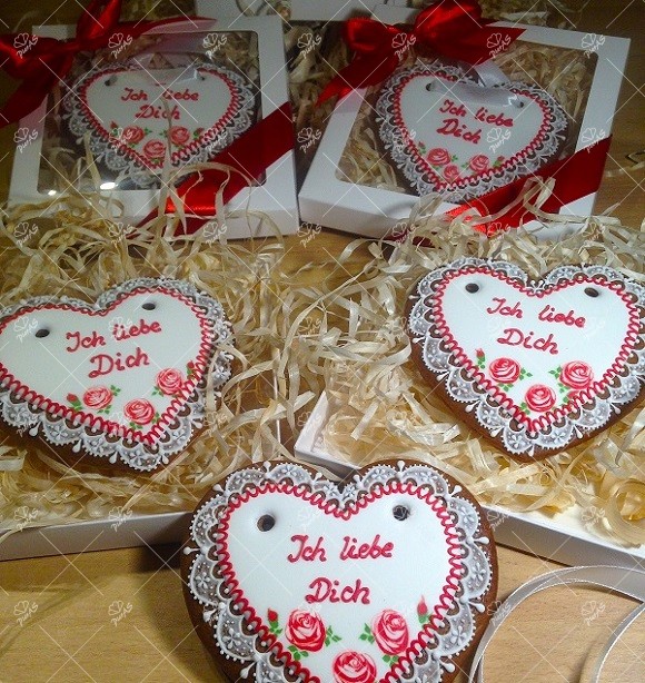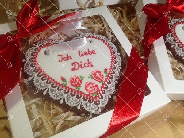 Białe serce z koronkami i czerwonym napisem ,,Ich liebe Dich,,